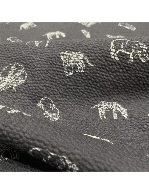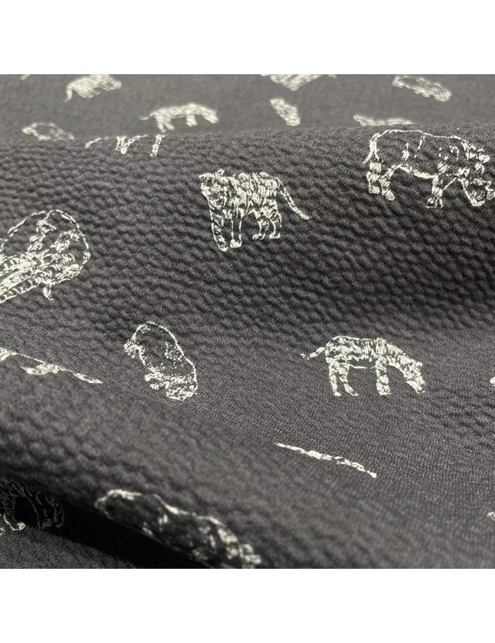 Apportez une touche d'originalité à vos créations avec ce tissu gaufré gris bleuté agrémenté de motif animaux stylisés.Sa texture donne un rendu atypique et ajoute du relief à vos projets. Léger et souple, ce tissu est idéal pour confectionner des vêtements confortables comme les sweats, une salopette ou un sarouel évolutif.