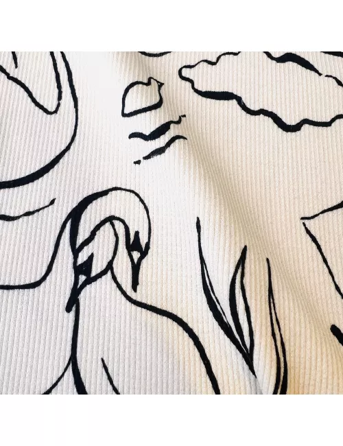 Tissu Jersey Côtelé Cygnes Écru - Motif Graphique Élégant