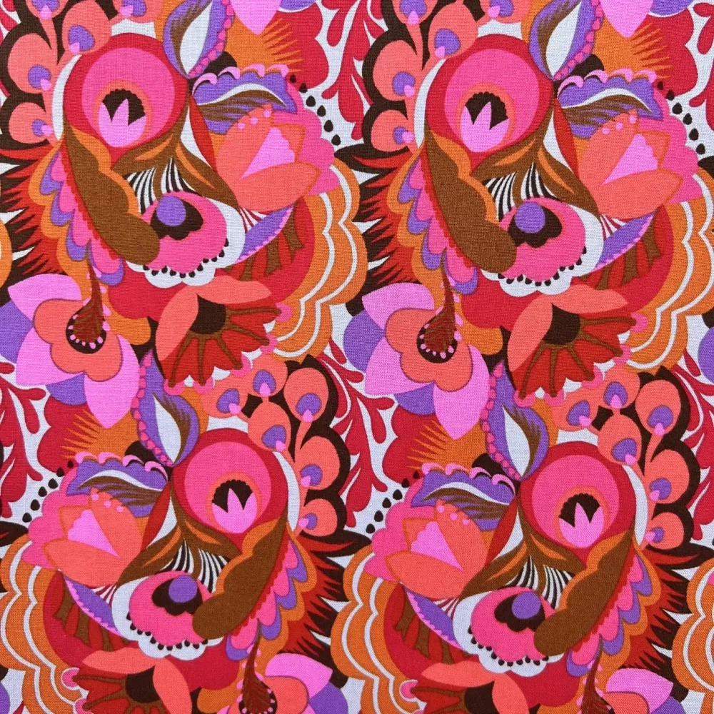 Ce tissu en 100% coton est un chefs d'oeuvre de plus de la designeuse Anna Maria, connue pour ces designs colorés. Ce mélange abstrait et réaliste d'hellébores orientales, de pivoines et de coquelicots vous emmène dans les années 70 avec ses teintes de fuschia, de mauve et de marron, sans oublier la jolie note de corail. Un régal pour les yeux.