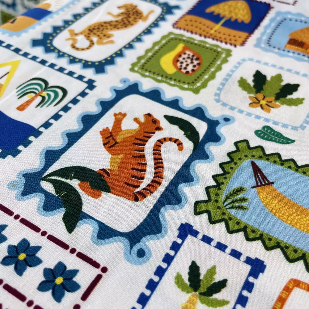 Cette popeline de coton fait partie de la Collection "Madhya Pradesh". Ce motif inspiré des design indiens met en lumière plusieurs symboles comme le tigre, le léopard, le soleil, les palmiers, etc. dans des timbres en référence aux cartes postales des vacances.
