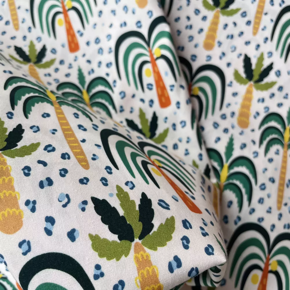 Cette popeline de coton fait partie de la Collection "Madhya Pradesh". Ce motif inspiré des design indiens met en lumière la jungle avec des plamiers stylisés et des tâches de léopard en écho aux autres tissus de al collection. Cette pospeline existe en version bleu ou fuschia.