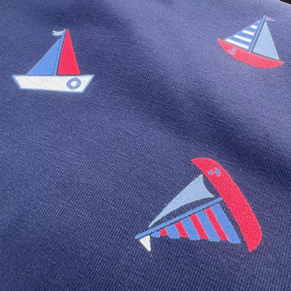 Et s'il on partez en bateau loin sur l'océan, les cheveux au vent ? Oui si on rêvez avec ce jersey en coton marine imprimé avec des petits bateaux! Des bateaux ornés de foil rouge pour apporter un peu de pep's dans la garde de robe de toute la famille.