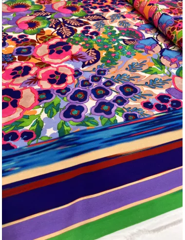 Cette viscose mixte une palette de couleurs assez étonnante avec ce bleu royal, ce fuschia d'hiver, ses notes de camel, d'écru, de blush et de beige. On imagine une petite blouse fluide avec un mélange de borderie anglaise en mode col à tarte ou une robe avec de jolis détails. Ce tissu apportera une ouche artistique à votre garde robe!